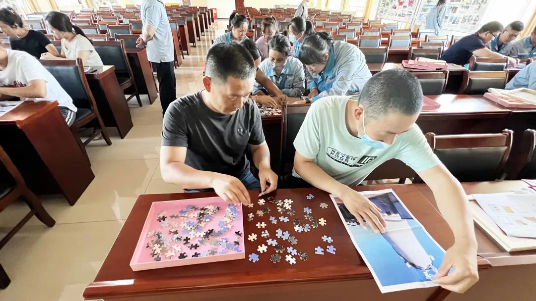 在拼圖比賽中,選手們集中注意力,分工明確,有的先從中間部分開始拼起,有的從四周開始拼起,你一塊我一塊,速度不遑多讓。